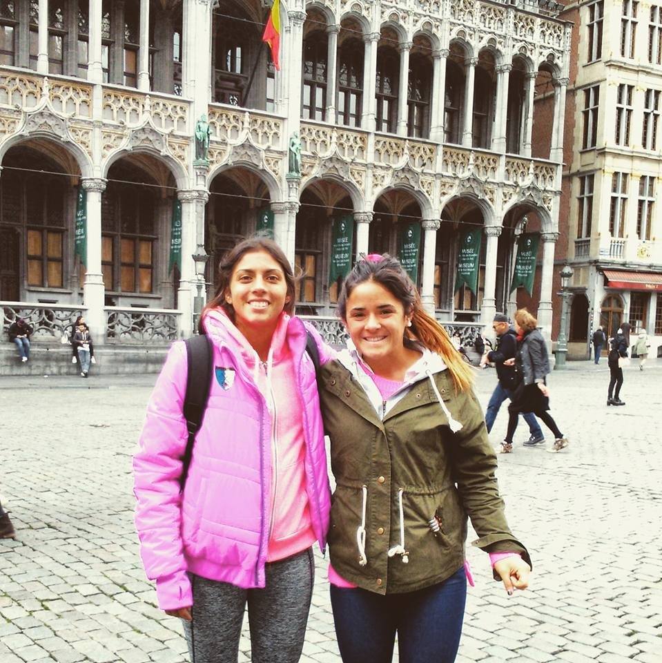 | En Bruselas con Majo Granatto, su compinche dentro y fuera de la cancha |